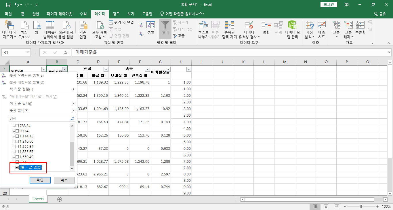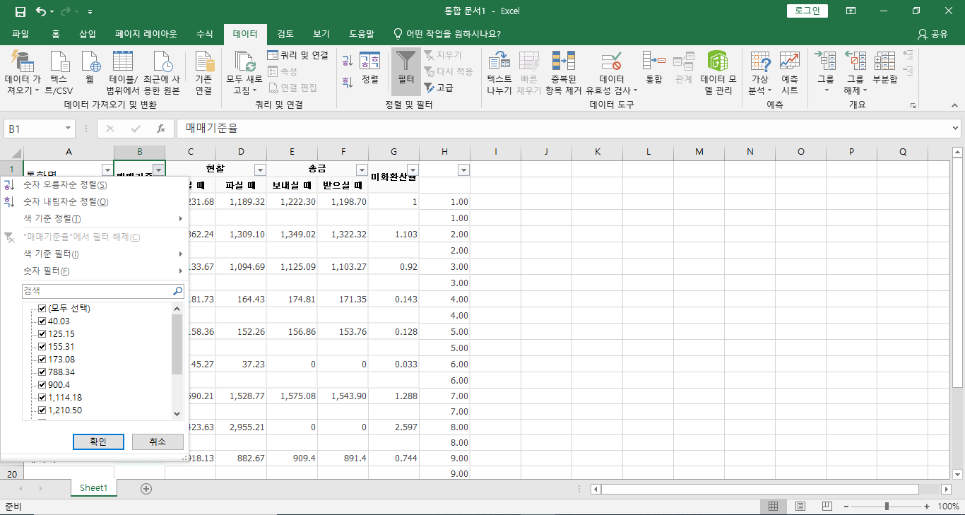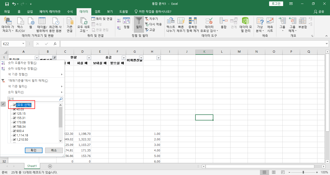 다시 매매기준율의 필터를 눌러 전체선택을 눌러줍니다.