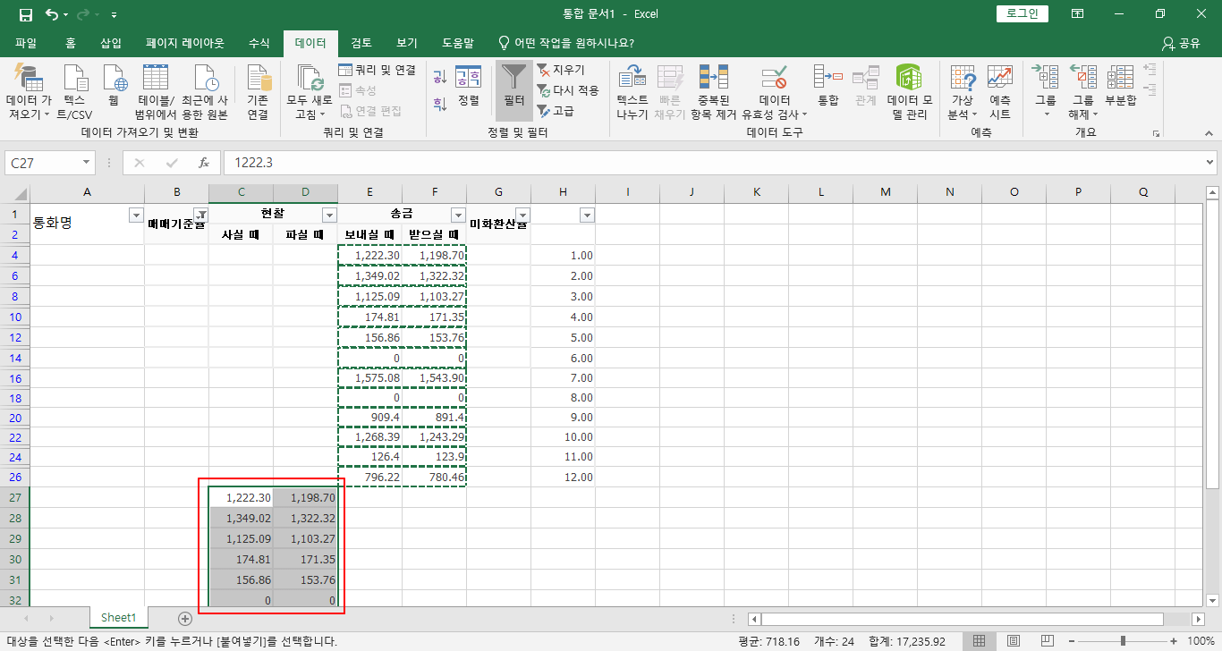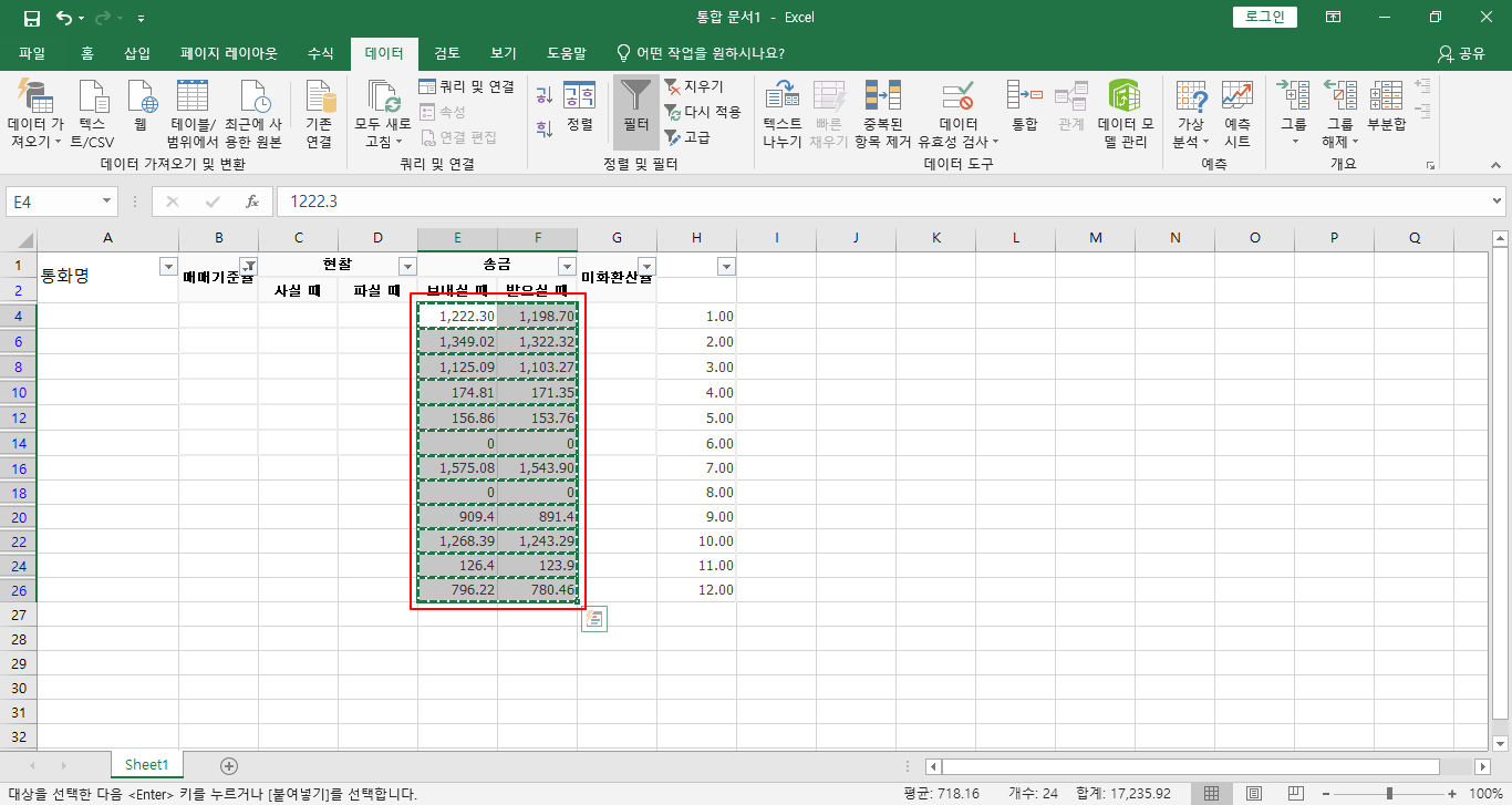 여기서는 출금 데이터를 현찰 아래로 옮겨보겠습니다.
