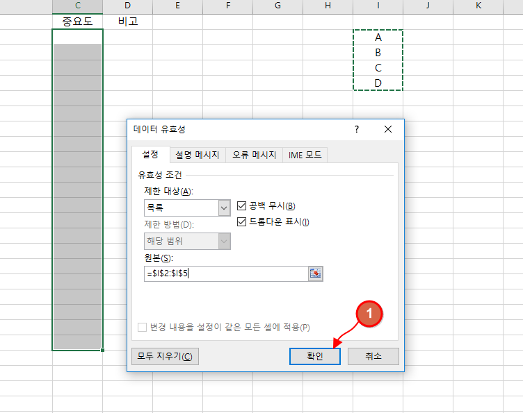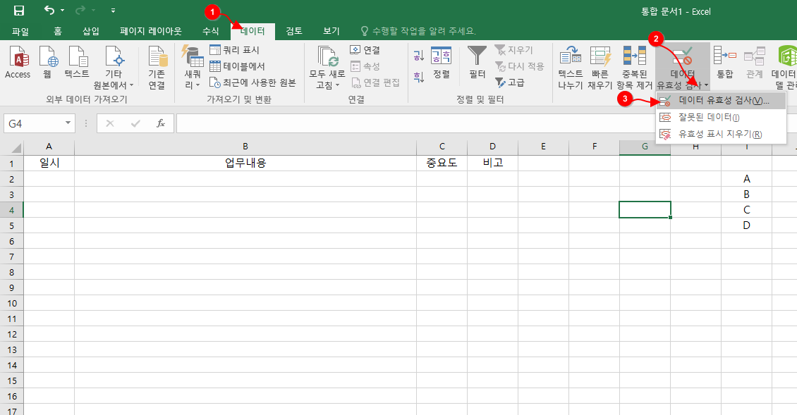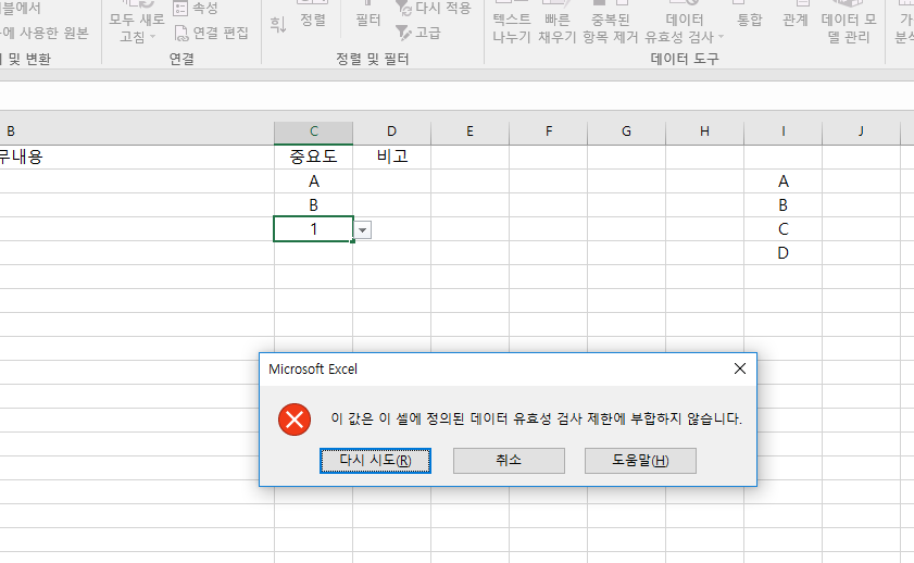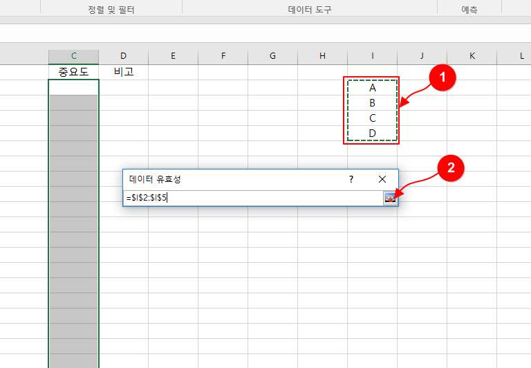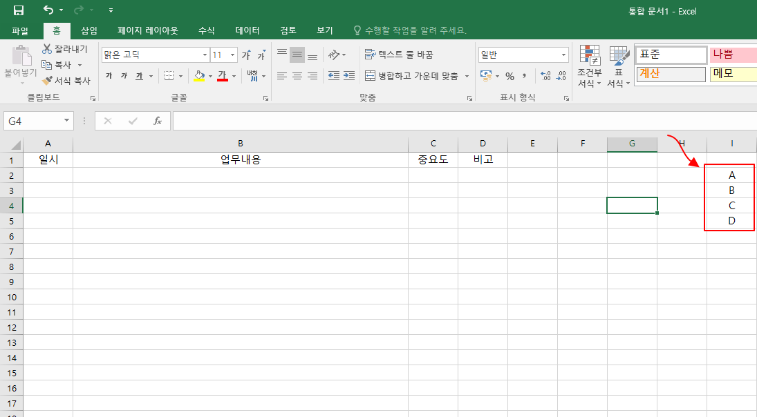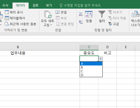 "C"열의 중요도 셀에 "A", "B", "C", "D" 이렇게 4가지 내용만 입력이 되도록 목록을 만들어 보겠습니다.