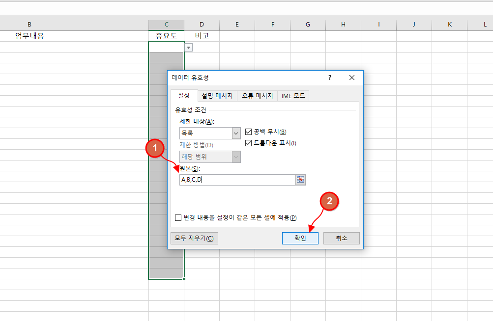 두 번째 방법은 데이터 유효성 설정창에서 바로 목록을 입력하는 방법입니다.